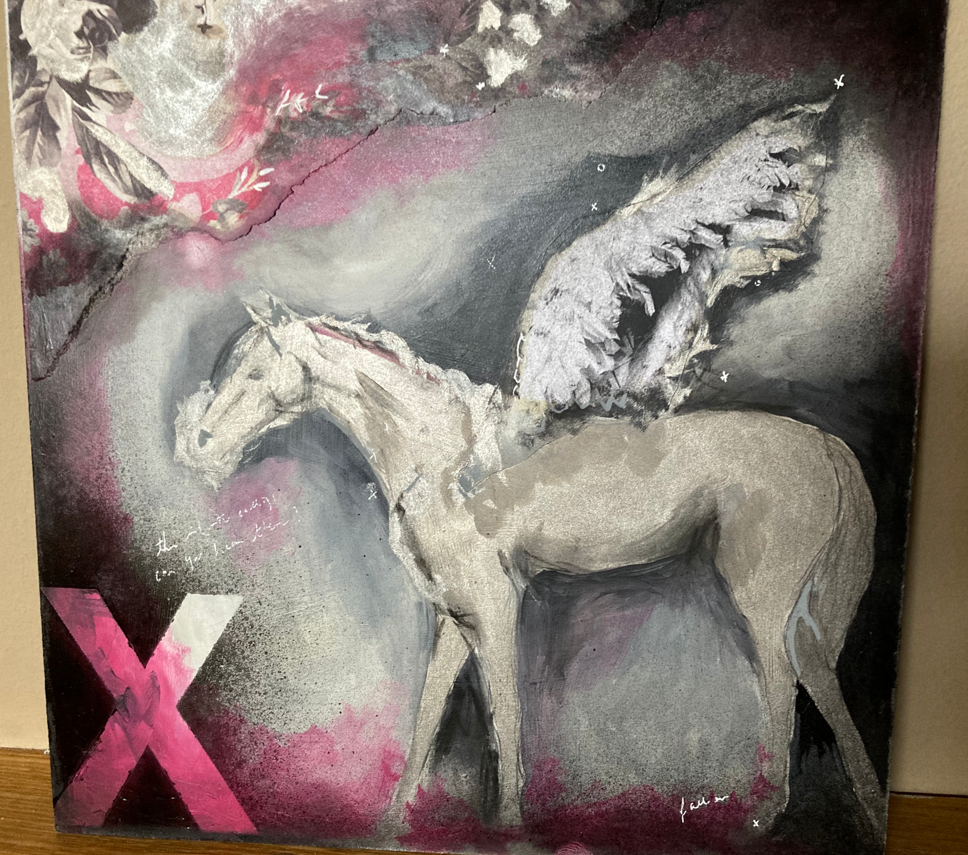 Beautiful, lush, winged horse, ready to take flight into a fever dream. Oil paint, spray paint, paper, pencil, 9.75"x9.75" board. Also available as a print (see separate listing)
