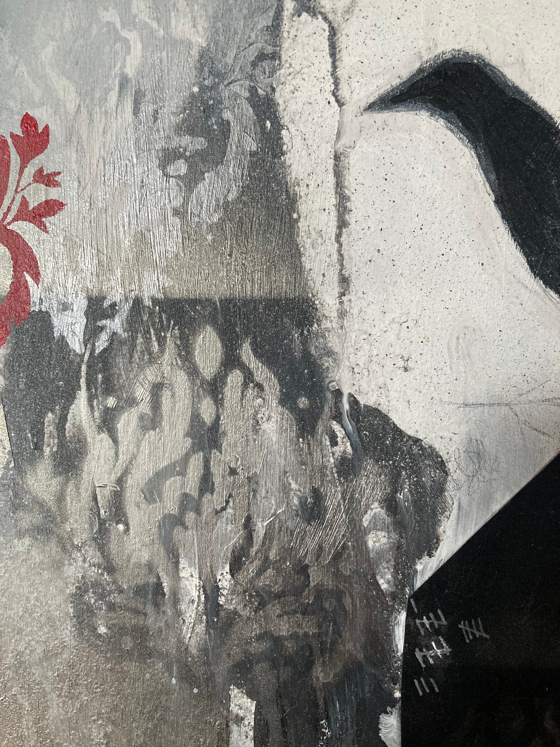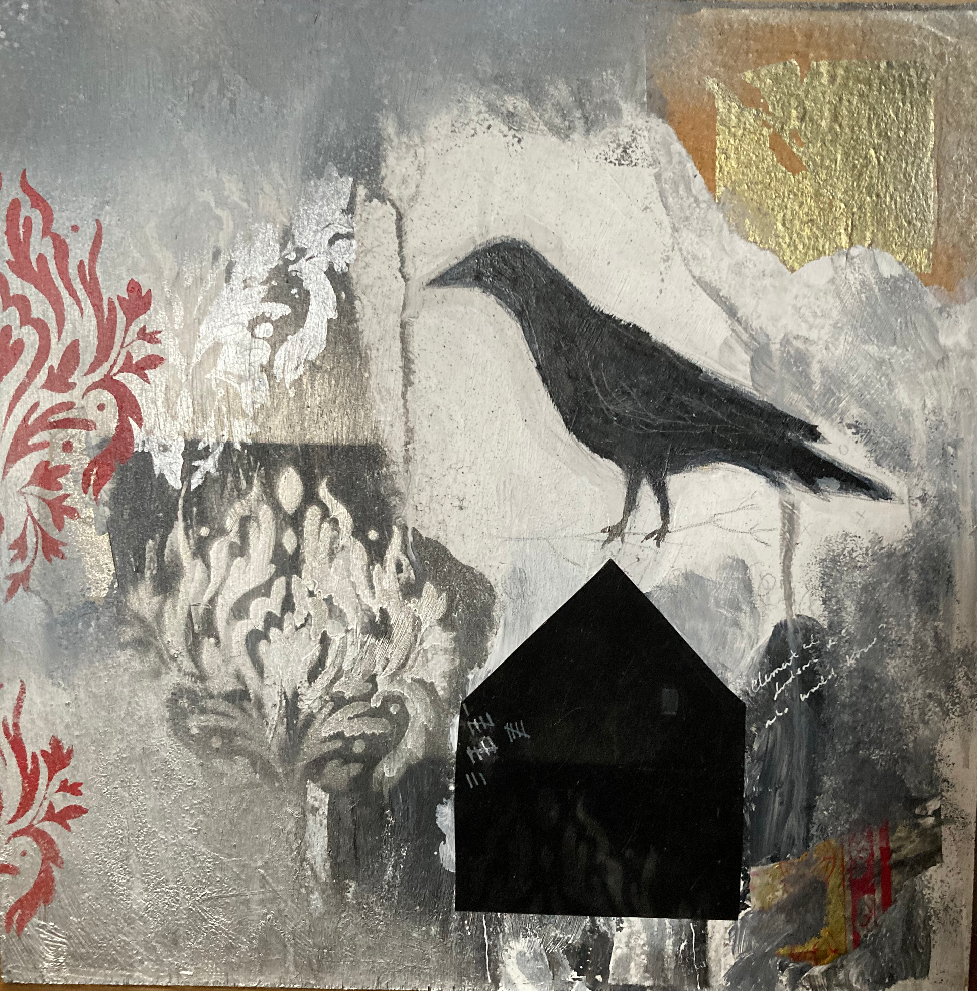 Beautiful little mixed media crow painting. Oil paint, spray paint, paper, velvet, pencil, 12"x12" on board.